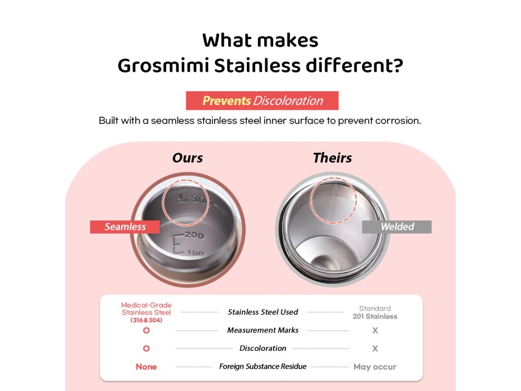 Szigetelt rozsdamentes acél edény szívószállal és praktikus One Touch flip-top fedél GROSMIMI 200 ml-es kapacitással - 6 hónapos és idősebb gyermekek számára készült, akiknek tartósabb palackra van szükségük hosszú távú hőmérséklet-megtartással. Két rétegű konstrukció prémium 304 és 316 orvosi minőségű rozsdamentes acélból, fejlett szivárgásmentes rendszerrel és praktikus One Touch flip-top fedéllel.