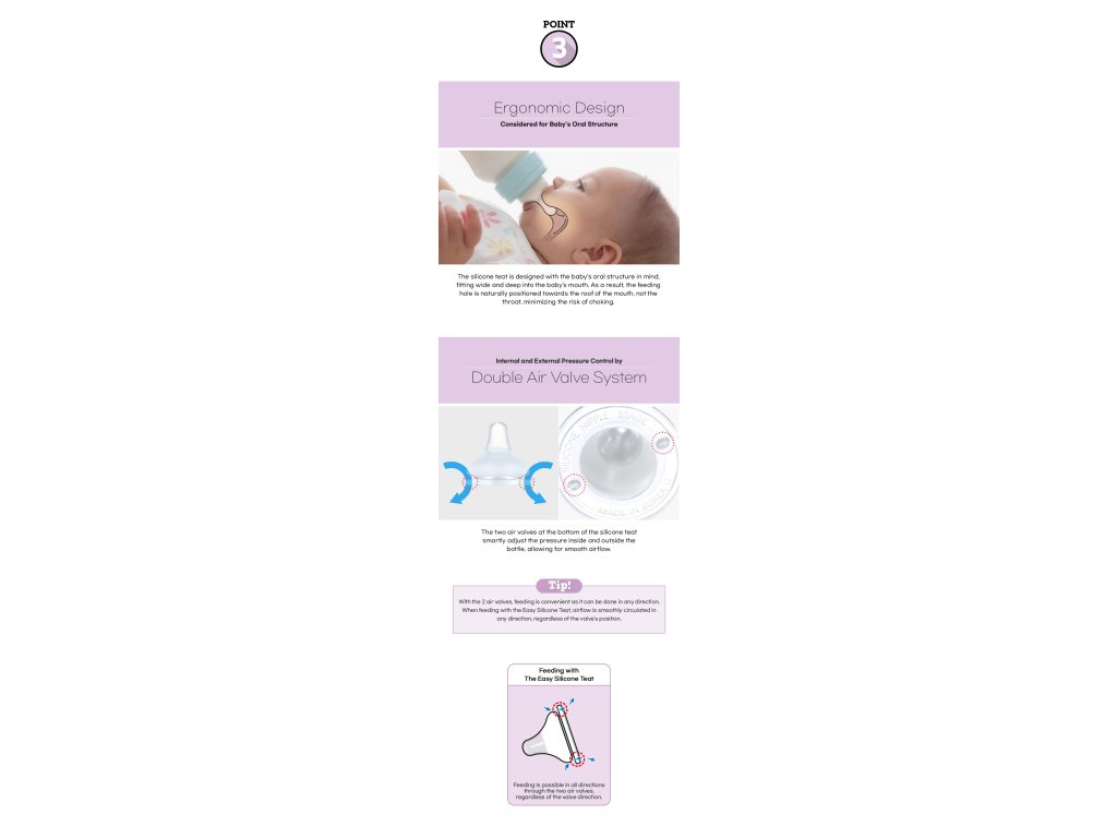 Az ergonomikus formájú The Easy Nipple cumi úgy lett kialakítva, hogy a lehető legjobban hasonlítson a természetes szoptatáshoz. Erősíti a szoptatás koordinációját, megakadályozza a cumi és az anya mellének összetévesztését, csökkenti az üveg elutasításának kockázatát a kombinált etetés során, és támogatja a szájüreg és az állkapocs izmainak helyes fejlődését.