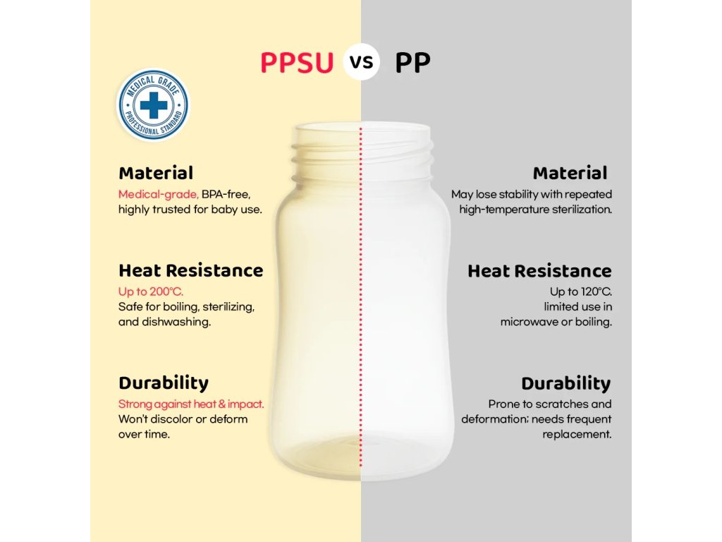 MIKROPLASZTIK- ÉS KÁROS VEGYI ANYAGMENTES - A PPSU orvosi minőségű anyag, amely nem szabadít fel mikroplasztikokat vagy toxikus anyagokat az italokba, még meleg folyadékok esetén sem. Kémiailag stabil anyag az egészségügyben.