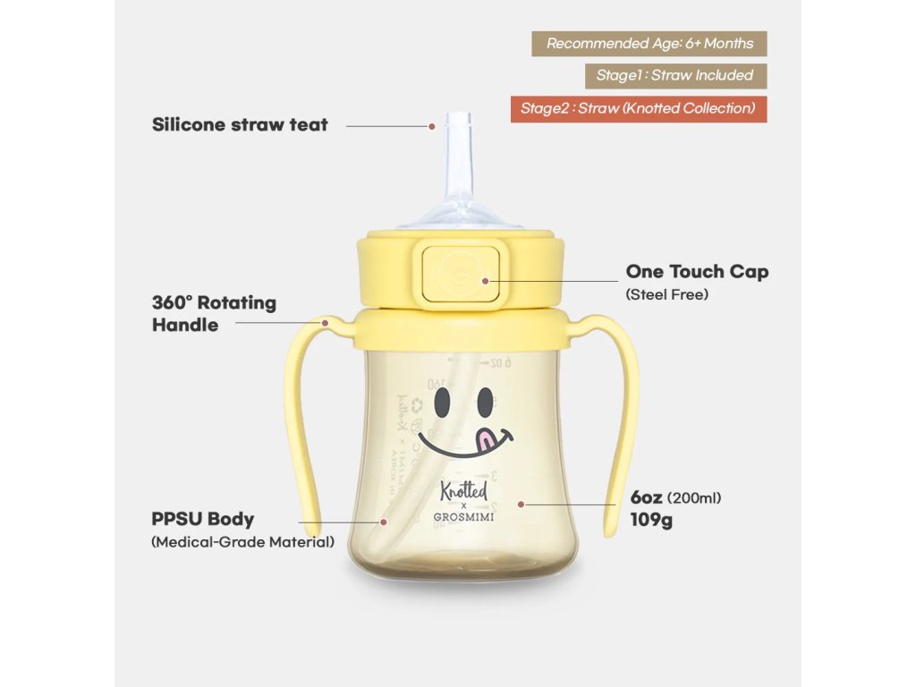 A GROSMIMI PPSU Szívószálas itatópohár 6 hónapos kortól (200ml) vagy 12 hónapos kortól (300ml) ajánlott gyermekek számára. Prémium PPSU orvosi minőségű anyagból készült, fejlett szivárgásmentes '+CUT' rendszerrel és praktikus One Touch flip-top fedéllel.