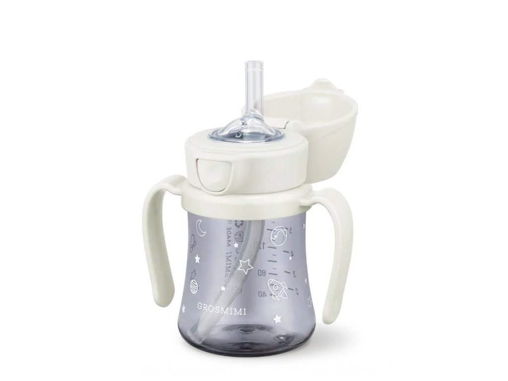 Gyermek itatópohár GROSMIMI PPSU Straw Cup 200 ml szilikon szívószállal és praktikus One Touch flip-top fedéllel. Orvosi minőségű PPSU anyag mikroplasztikok nélkül, szivárgásmentes technológia és 360°-ban forgó fogantyúk. Ideális az első lépésekhez az önálló ivás felé. Szín Fehér – fehér