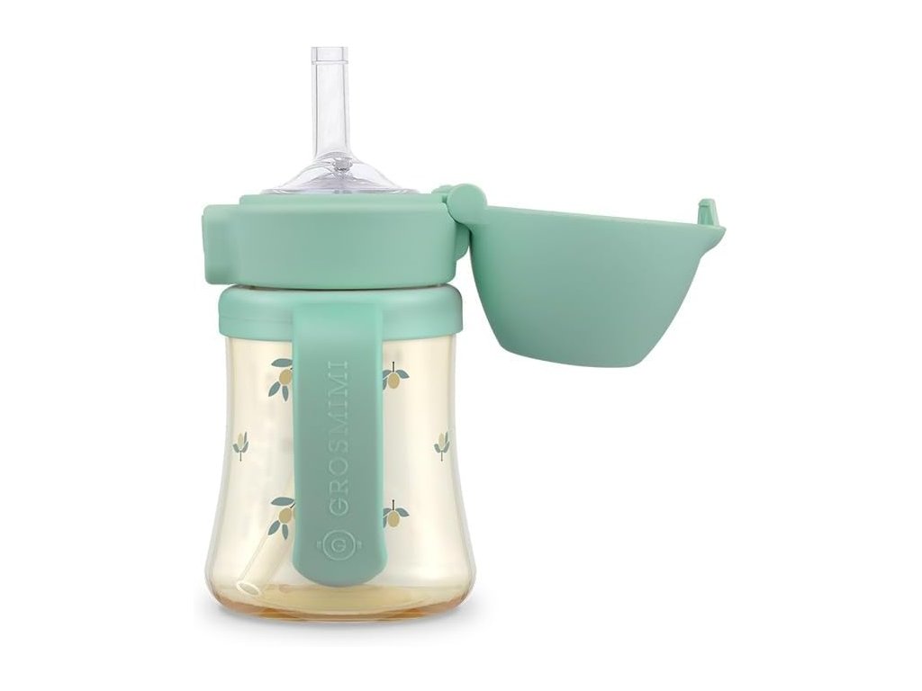 Gyermek itatópohár GROSMIMI PPSU Straw Cup 200 ml szilikon szívószállal és praktikus One Touch flip-top fedéllel. Orvosi minőségű PPSU anyag mikroplasztikok nélkül, szivárgásmentes technológia és 360°-ban forgó fogantyúk. Ideális az első lépésekhez az önálló ivás felé. Szín: Pistachio – pisztáciás