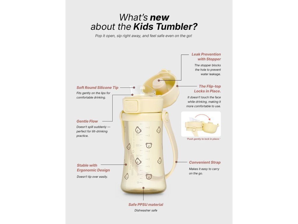 A GROSMIMI Kids Tumbler 300 ml-es PPSU gyermek itatópohár 18 hónapos kortól ajánlott, könnyű, tartós és biztonságos mindennapi használatra. Prémium PPSU orvosi minőségű anyagból készült, amely tartós, biztonságos és ideális aktív gyermekek számára.
