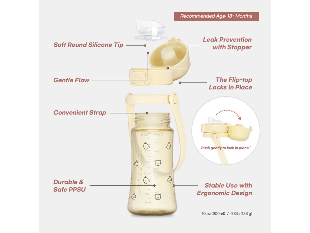 Orvosi minőségű PPSU anyag - mikroplasztikmentes. Kémiailag stabil - nem szabadít fel káros anyagokat még meleg italok esetén sem. BPA-, ftalátmentes és egyéb veszélyes vegyi anyagoktól mentes. Rendkívül könnyű - csak 133g (94g-kal könnyebb, mint a rozsdamentes acél változat). Ellenálló ütéseknek és deformációnak. Hőálló 200°C-ig. Platina szilikon szájrész orvosi minőség - legmagasabb szint. Ellenállóbb, mint a hagyományos szilikon - harapásnak és kopásnak ellenálló. Szabályozott finom áramlás - biztonságos ivás, hirtelen kiömlés nélkül. One Touch fedél flip-top zárással. Szilikon tömítés a kifolyás ellen. Nem szivárog, stabil kialakítás. Kényelmes ergonomikus pánt a hordozáshoz. Űrtartalom 300 ml - ideális 18 hónapos kortól. Otthoni és óvodai mindennapi használatra. Egyszerű tisztítás - minden része szétszerelhető. Mosogatógépben tisztítható és forró vízzel sterilizálható. Koreában készült. Színek és dizájnok: Bear Butter, Olive Pistachio, Cherry Peach.
