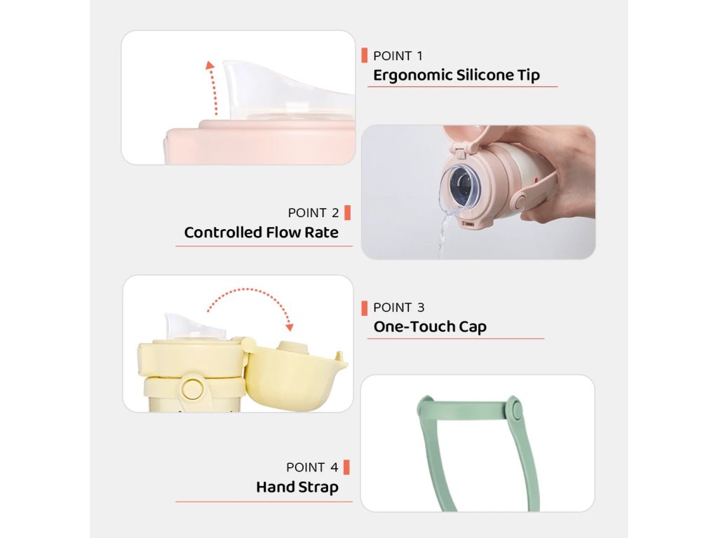 A szájrész gyengéd a gyermekek ínyéhez és lehetővé teszi a természetes ivást. A szabályozott áramlás biztosítja, hogy a gyermek kényelmesen és biztonságosan igyon fulladás veszélye vagy hirtelen kiömlés nélkül. A kialakítás lehetővé teszi az ivást döntött szögben, ami támogatja a gyermek önállóságát.