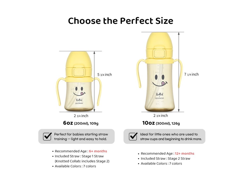 Stage 1 Szívószál - 6 hónapos kortól, puhább és rövidebb, ideális kezdőknek (200ml verzió része). Stage 2 Szívószál - 12 hónapos kortól, tartósabb haladóknak (300ml verzió része, Knotted kollaboráció).