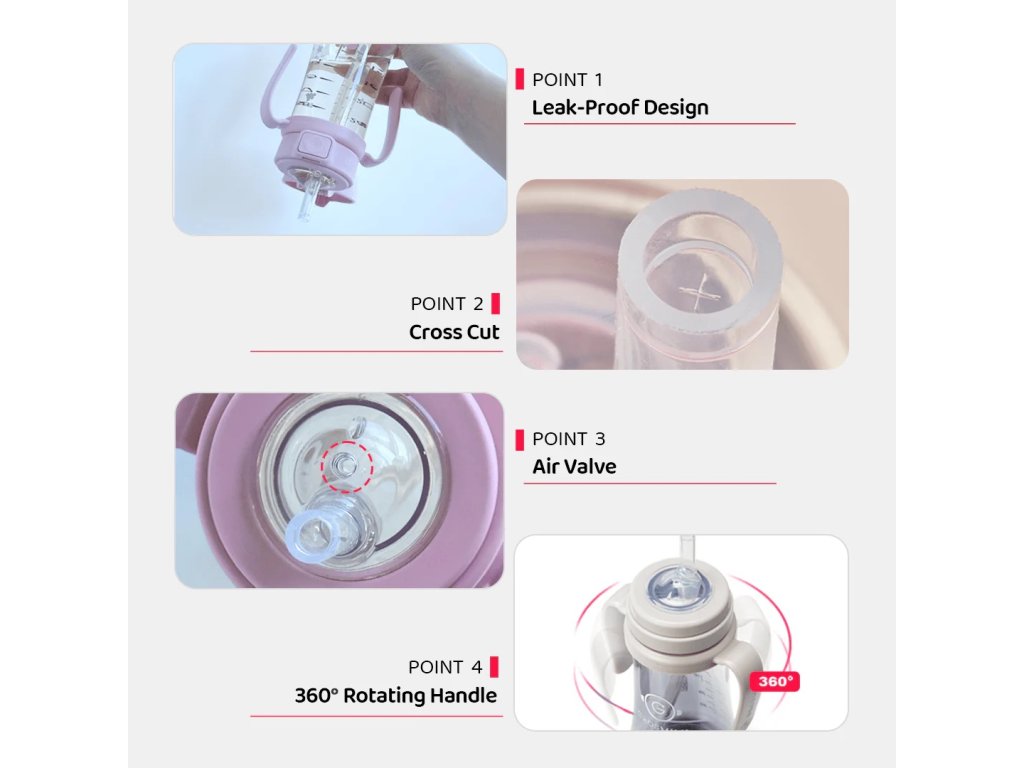 Orvosi minőségű PPSU - mikroplasztikmentes. Kémiailag stabil - hőálló 200°C-ig. Platina szilikon szívószál - ellenálló és biztonságos. '+CUT' technológia - szivárgásmentes. One Touch fedél - egyszerű használat. 360° forgó fogantyúk - ergonomikus fogás. Stage 1 és Stage 2 szívószálak - növekszik a gyermekkel. Stabil kialakítás - nem borul fel. Mosogatógépben tisztítható és sterilizálható. Átlátszó - látható az ital mennyisége. BPA-, ftalátmentes. 200ml (109g, 6M+) és 300ml (126g, 12M+) változat. Koreában készült.