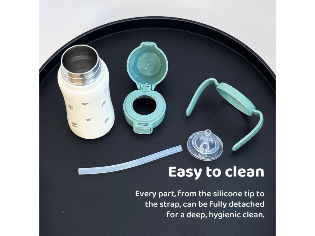 Minden alkatrész - beleértve a szilikon szívószálat, fedél, tömítéseket, fogantyúkat, levegőszabályozót és védőburkolat - teljesen szétszedhető a higiénikus tisztítás érdekében. A 316-os rozsdamentes acél belső felület megakadályozza a baktériumok felhalmozódását. A palack mosogatógépben (felső polc) tisztítható, és forró vízzel sterilizálható. Ajánljuk a szívószálak speciális keféjét a belső tisztítás érdekében.